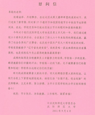 秋菊溢彩、丹桂飘香。在这收获成果又播种希望的美好时节,我们迎来了新学期,同时第27个教师节和我国传统节日中秋佳节也即将到来。在此,学校党委和行政向您致以节日的慰问和崇高的敬意!