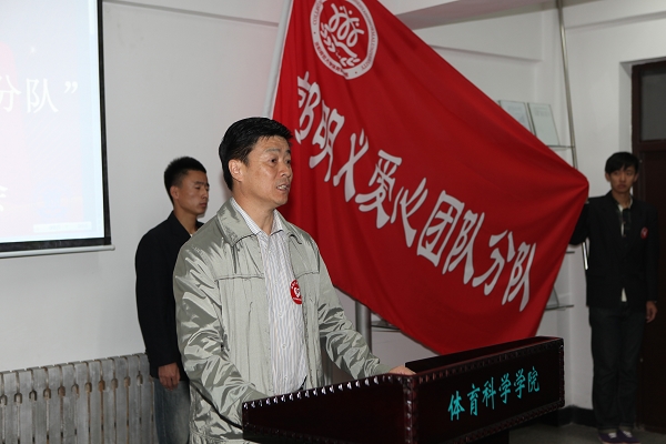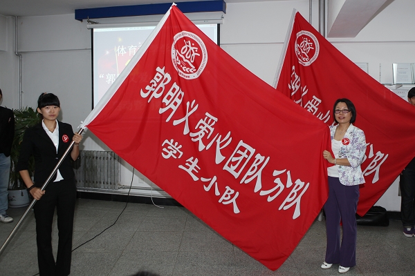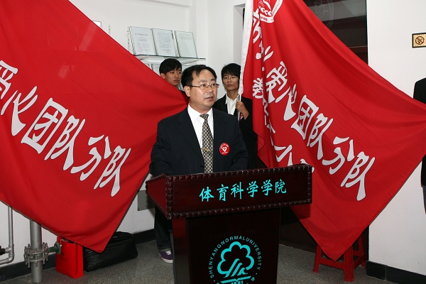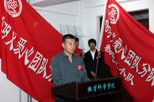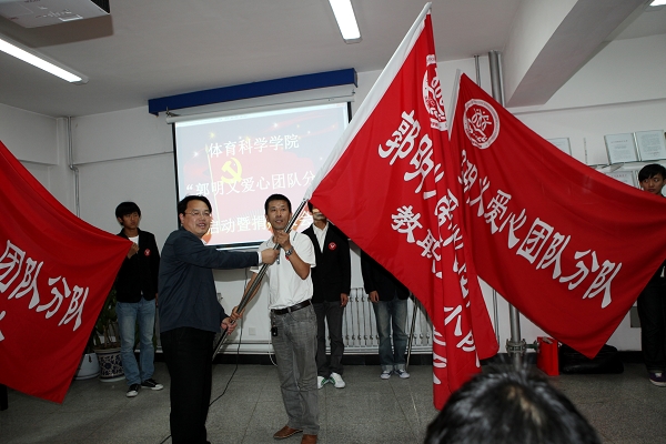 党委副书记林群为体育科学学院“郭明义爱心团队分队”授旗