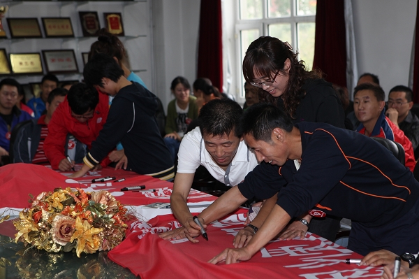 学校党委副书记林群为“郭明义爱心团队分队”授旗,党委组织部部长贾玉明、宣传部部长张艳伟分别为“教职工小队”和“学生小队”授旗。“教职工小队”和“学生小队”的全体志愿者分别宣誓。他们承诺,将努力向郭明义同志学习,不断提高自身素质,做甘于奉献的沈师体育人。宣誓后,团队全体成员郑重地在队旗上签下了自己的名字。