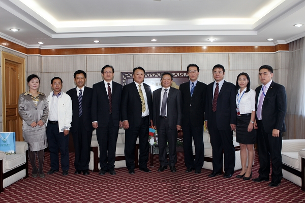 9月22日下午,前来参加“2011国际和平日纪念活动暨东北亚发展论坛”的蒙古国东戈壁省省长刚乎亚戈率14个县县长来必赢官网参观访问,必赢官网党委书记于文明、副校长张辉一同会见了代表团一行。