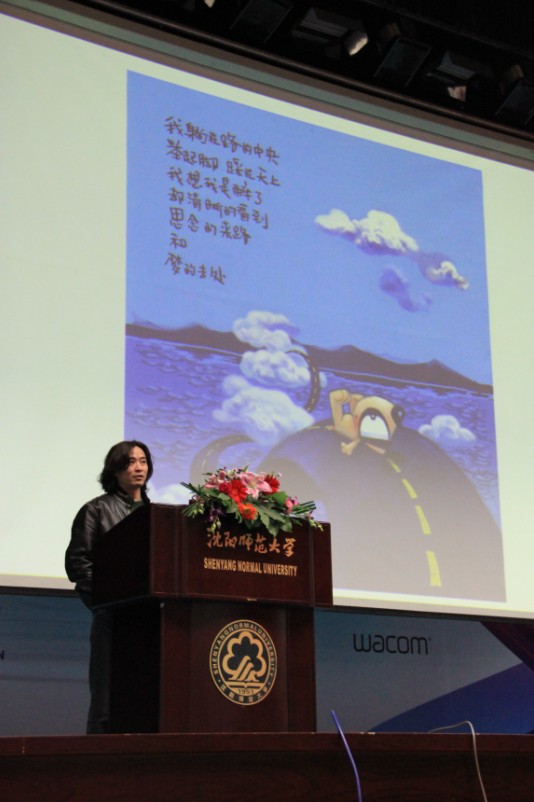 随后省美协动漫艺委会常务副主任墨恋、WACOM公司总裁林强先生、沈阳非凡科技有限公司关益先生先后致辞。上午的重头戏——国际著名漫画家慕容引刀先生的《刀刀狗》创作历程分享环节格外引人瞩目,掀起了此次交流会的第一个高潮。