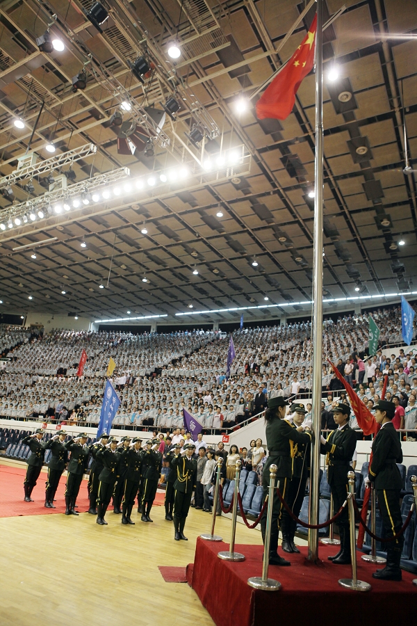 伴随着慷慨激昂的乐曲,各学院新生代表高举院旗向所在学院的院长报到。他们代表着来自五湖四海的5415名本科生、983名研究生、511名专科生和13个国家的80名留学生正式报到。他们的到来,为师大注入了新鲜的血液,给学校发展增添了活力。