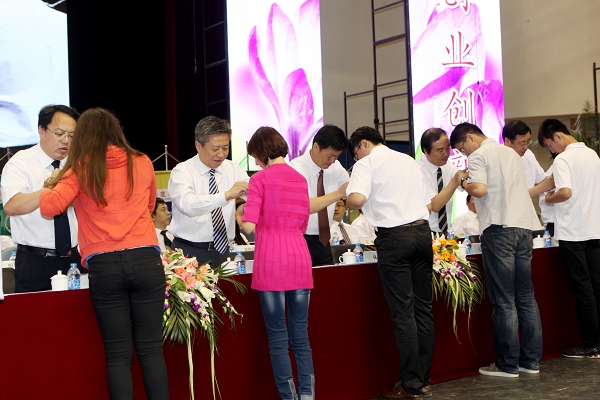 主席台前排领导为各学院新生代表佩戴校徽
