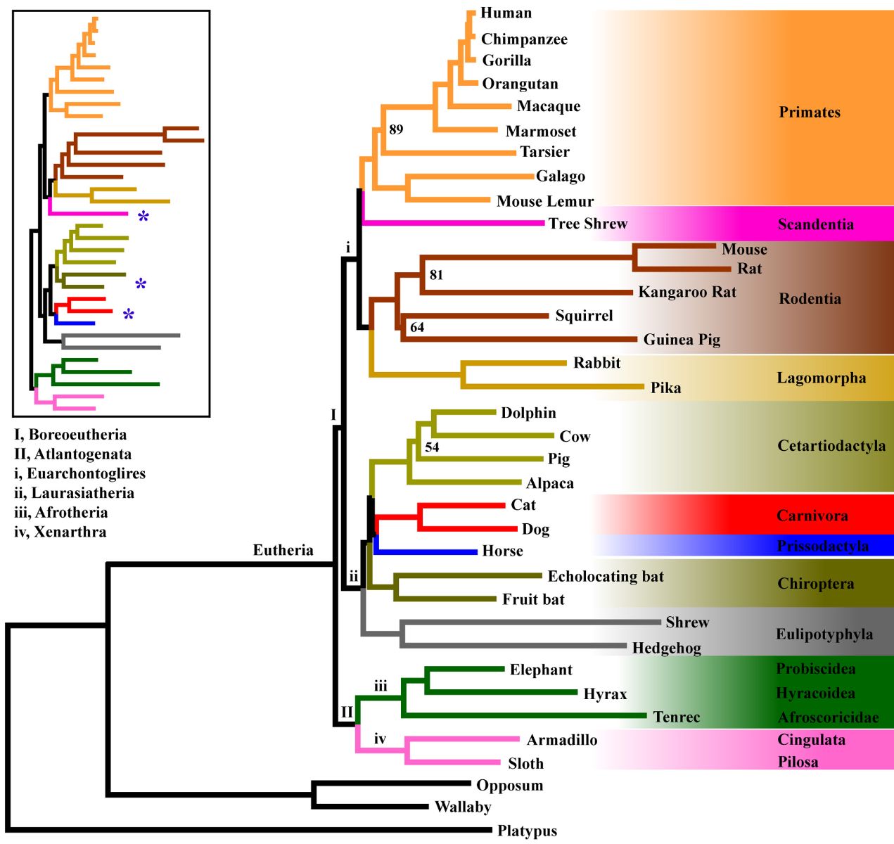 应用全基因组数据与溯祖分析方法重构的哺乳动物系统发育关系图