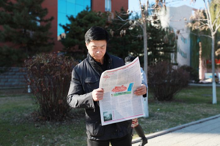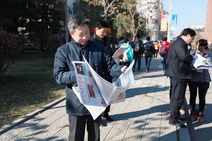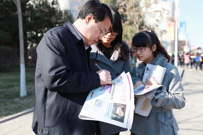 期间,学校党委书记于文明、校长林群、党委副书记贾玉明来到活动现场,他们接过同学们发放的校报认真地翻阅起来,并对校园记者们提出了殷切希望。于文明书记对校园记者们说:“要讲政治、重大局、强素质,要勤于思考,扎实工作 ,发挥好校园新闻媒体的作用,助推学校各项事业的发展。林群校长鼓励大家说:“要立足校园,精心策划,围绕学校的中心工作进行有力宣传,在工作中增长才干,成为学校与学生之间沟通的桥梁和纽带。”贾玉明副书记特别叮嘱同学们:“要兼顾好学习和工作,培养业务能力,提高自身素质,在不断学习和锻炼中成长、成才。”贾书记还欣然为记者团题字:“愿大学生记者团成为服务广大同学的平台,磨练自己成长的舞台!” 学校领导的关怀和关注使在场的同学们倍受鼓舞,倍感温暖。大家纷纷表示,今后一定更好地利用这个平台,锻炼自己的能力,为学校的宣传工作做贡献。