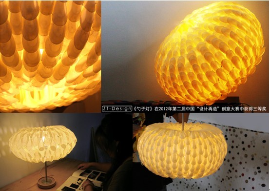 创作理念:创作团队的师生们收集了很多用过的塑料勺子,利用勺子的造型和半透光的特性,做了系列灯罩。灯罩是以构成的方式排列组合的,用热熔胶进行粘接。内部采用温度低的节能灯泡,既可以当台灯,也可以当吊灯或座灯。《勺子灯》给人以含苞待放的花朵的视觉感受,又像天鹅身上叠加的层层羽毛。