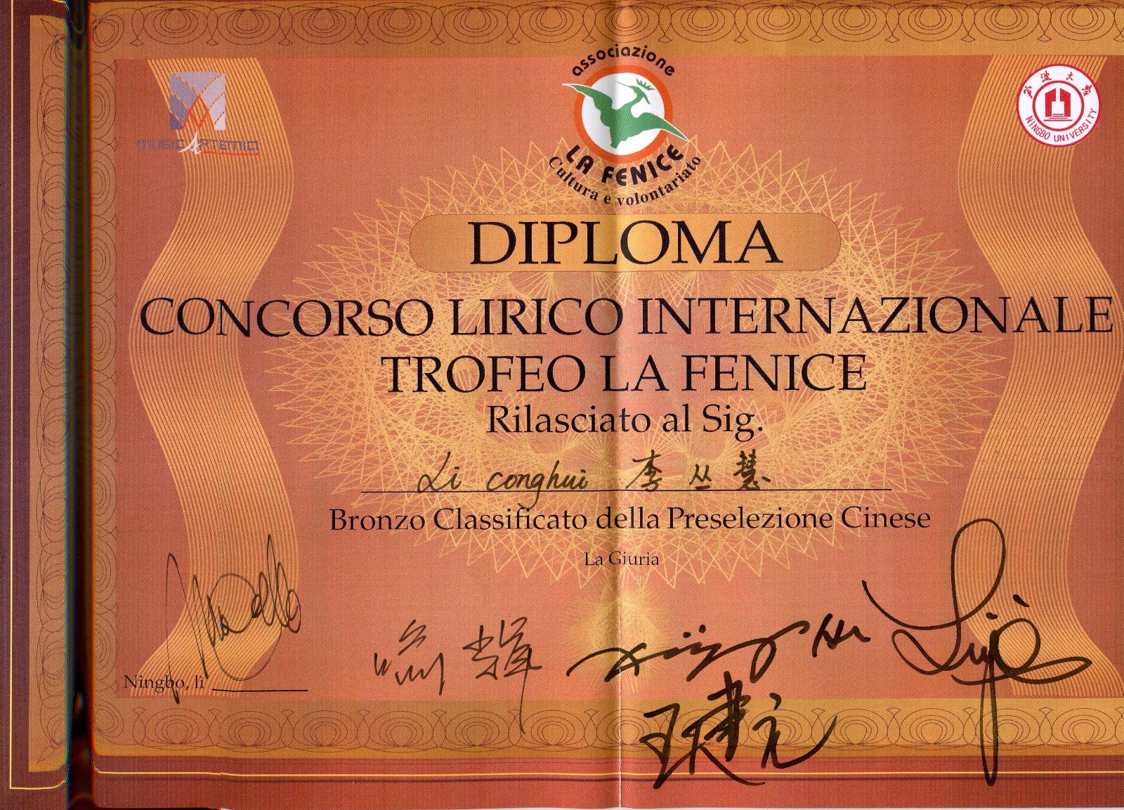 3月22日-25日,由意大利“拉菲尼契”协会主办,宁波大学艺术学院承办的第五届“拉菲尼契”杯国际声乐比赛中国选拔赛在宁波大学艺术学院隆重举行。必赢官网音乐学院声乐系副教授李丛慧在该项比赛中荣获铜奖。