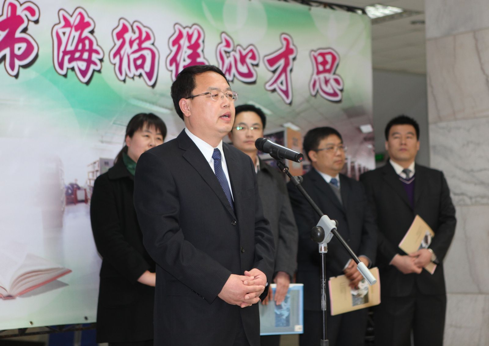 党委副书记贾玉明在开幕式上致辞。他首先向第四届大学生读书文化节开幕表示祝贺,同时他建议同学们在读书时要精选阅读书目,多读书、读好书;要追求阅读品质;要交流阅读体会,正所谓“奇文共欣赏,疑义相与析”;要养成良好的阅读习惯。他强调,大学生读书文化节活动的开展要与师大积极向上的校园文化相结合,注重内容,不搞形式;要与培养大学生成长、成才相结合,引导学生结合本专业和个人兴趣读好书;要与党的十八大提出的社会主义核心价值观教育相结合,使读书文化节活动取得实效并在大学生中产生广泛影响。