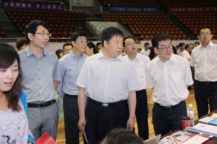 贾玉明副书记(左三)陪同省教育厅唐国华副厅长(左二)、省大学生就业指导局刘铸局长(左一)在招聘会现场
