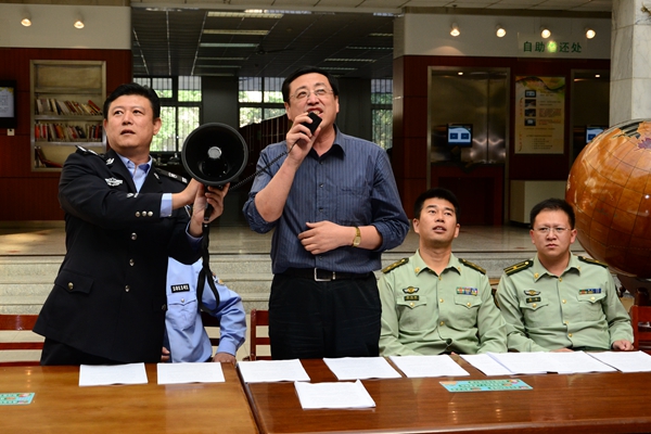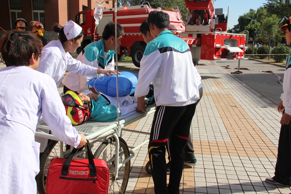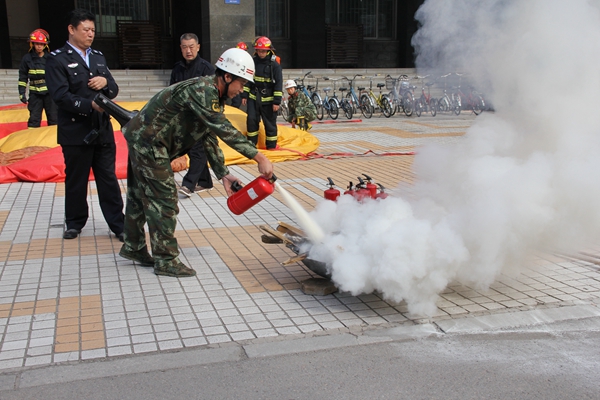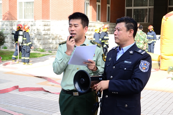 副校长夏敏,学校相关职能部门负责人,2013级2500余名同学观摩了此次演练。演练分为突发事件应急疏散和灭火实际操作两部分,由道义消防中队队长曲运海指挥。