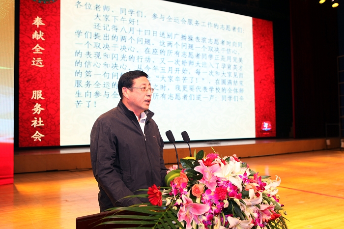 副校长夏敏在讲话中,充分肯定了参演学生和志愿者在全运会中的完美表现,他以“奉献全运,服务社会”为主题,把“修身、齐家、治国、平天下”当做服务社会的指南,强调了同学们在实现梦想的过程中要收获自身的成长,集体的力量和价值的体现。他与大家分享了自己在海拔近4000米高的雪域边疆——西藏高原上服务社会的经历,真切讲述了具有高远的志向、奉献精神以及熟练掌握本领的重要性和必要性。