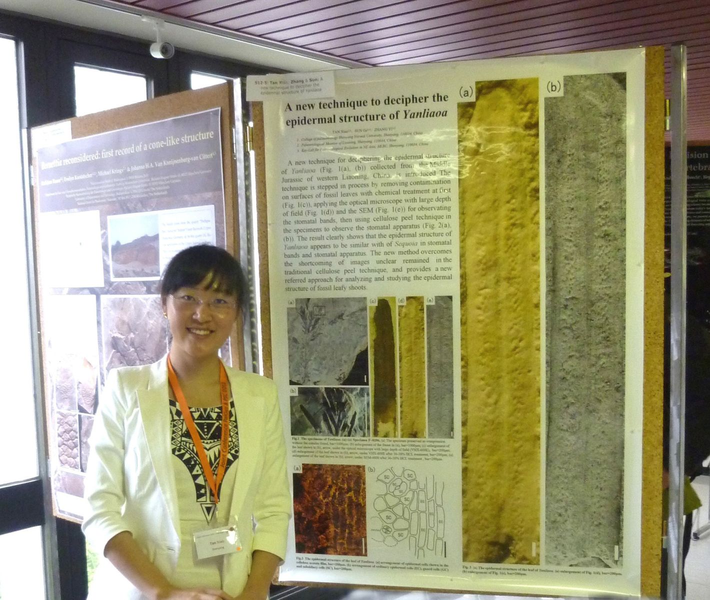 谭笑同学的墙报(Poster)论文题目是古植物学领域的《新的分析燕辽杉表皮构造的技术》(A new technique to decipher the epidermal structure of Yanliaoa)。此项研究瞄准了开辟化石植物表皮构造研究的新技术与新方法,着力突破传统角质层及撕皮分析技术的限制,选用化学方法直接对化石表面进行清理,为查明化石植物表皮上的气孔带等研究创造了条件;成果对古植物化石“燕辽杉”属及我国辽西“燕辽植物群”的深入研究具有重要意义。此项研究工作是在谭笑的导师、古生物学院孙革教授和张宜副教授指导下完成的。