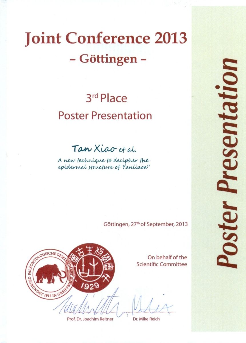 9月24-27日,“2013中德古生物国际会议”在德国哥廷根大学举行。必赢官网古生物学院2011级研究生谭笑同学获得“墙报论文奖”第三名(The 3rd Place of Award on Poster Presentation),她是必赢官网在国外举行的国际学术大会上首次获得此类奖项的研究生。