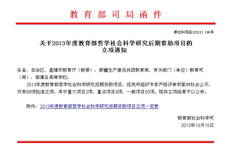 据了解,2013年度教育部哲学社会科学研究后期资助项目,经专家严格评审并面向社会公示,共有66项批准立项,其中重大项目2项,重点项目9项,一般项目55项。