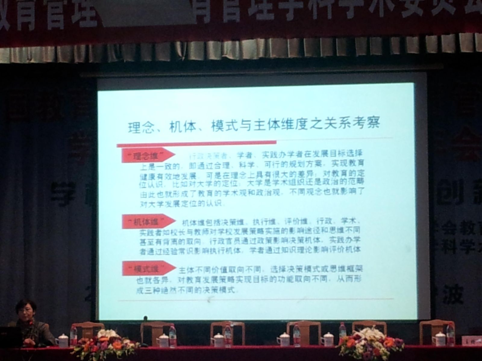 孙绵涛教授应邀作为第一个主题报告人在大会上作了题为《中国当下教育改革政策的走势探析》的报告。报告从教育政策的内容、过程、环境、方法及价值五个维度系统分析了新一届政府政治、经济、社会等政策调整对于教育政策的影响,并对未来教育改革趋势进行了理性思考和合理预测。此外,孙绵涛教授还主持了一场大会主题报告,并从报告的题目、内容及研究方法论等角度对四名报告人的报告进行了点评。在“教育管理基本理论”分会场及教育行政与教育政策分会场,孙绵涛教授也应邀对发言人的报告进行了学术点评。会上,康翠萍教授作了题为《健康型大学发展决策模式选择》的主题报告。报告总结了现实学校发展的“行策”、“知策”和“治策”三种决策模式,指出了基于各种决策模式面临的现实困境,提出了基于协同理念构建的健康型大学发展“知策-行策-治策”综合式的决策模式。孙绵涛教授、康翠萍教授的主题报告及孙绵涛教授的学术点评,体现了他们对教育管理研究深层次、前瞻性的思考,引发了与会成员热烈讨论和广泛关注。