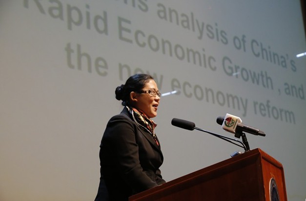 两场讲座中,冯丽以详尽的数据围绕中国改革开放以来经济发展状况、原因以及当前面临的机遇与挑战等进行了阐述,回答了现场商务人士和学生关心的问题,赢得了听众的热烈掌声。