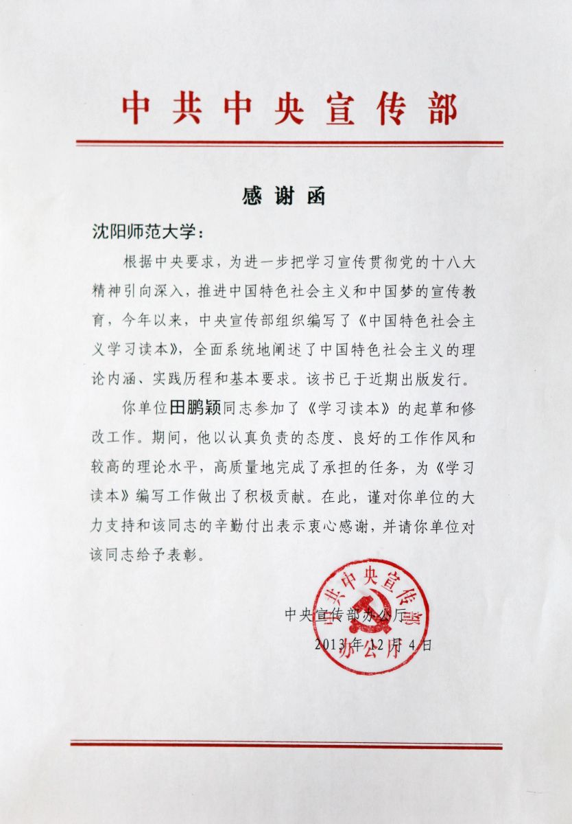 感谢函指出,田鹏颖同志参加了《学习读本》的起草和修改工作。期间,他以认真负责的态度、良好的工作作风和较高的理论水平,高质量地完成了承担的任务,为《学习读本》编写工作做出了积极贡献。