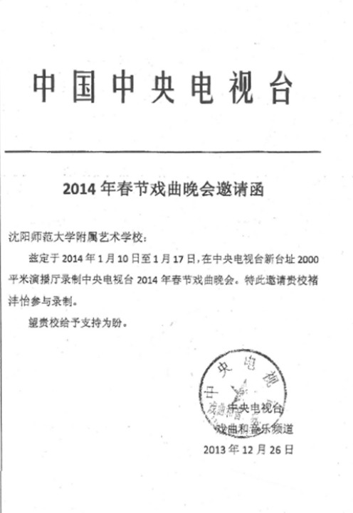 附属艺术学校戏曲专业学生褚沣怡于12月27日正式收到中央电视台2014年春节戏曲晚会邀请函,将参与春节戏曲晚会的录制。
