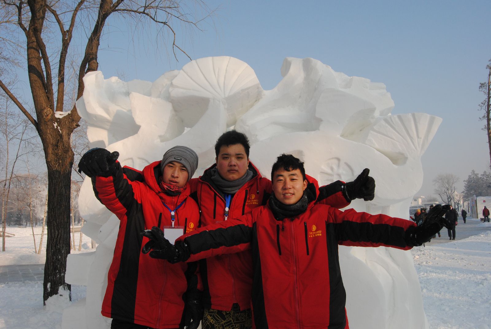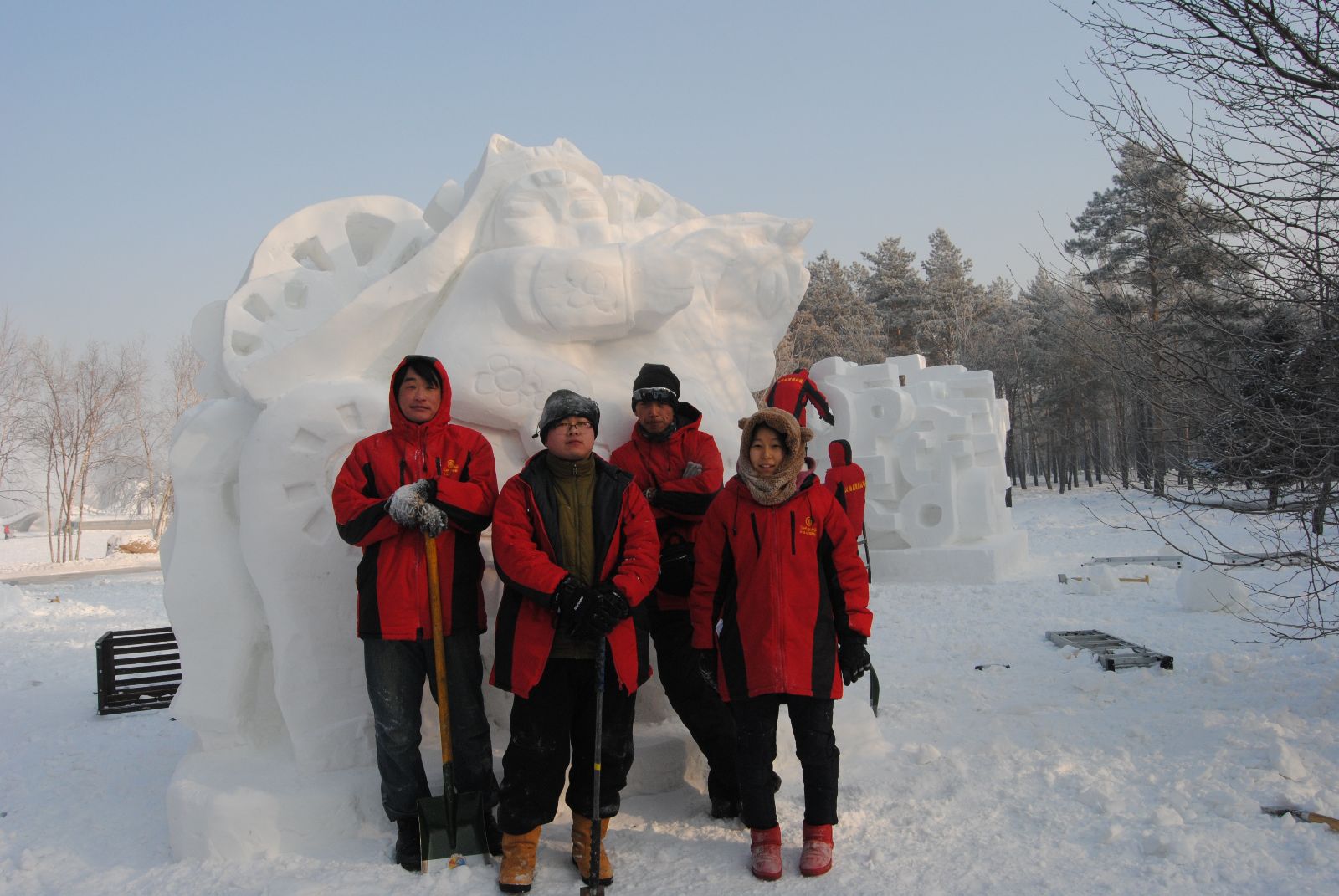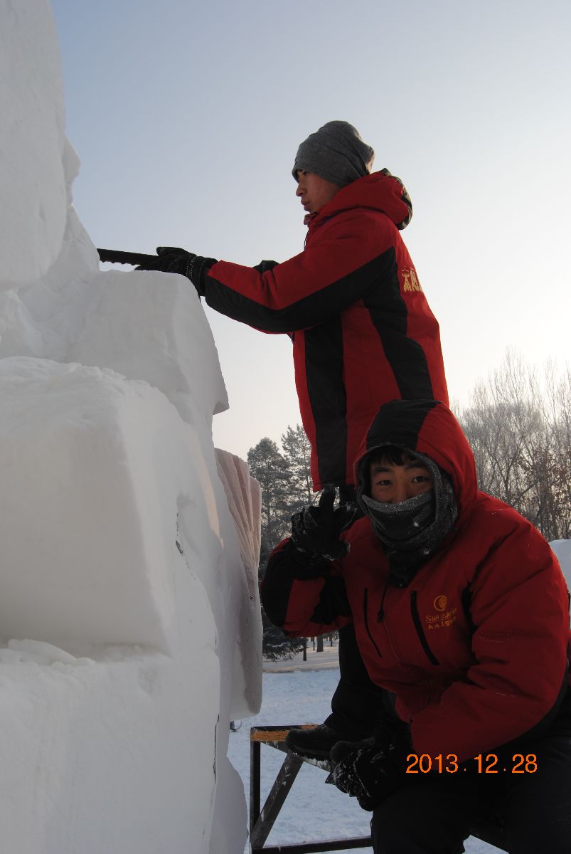 据了解,本次赛事的参赛工作,得到了司徒安院长的高度重视,选拔指导教师和学生参加比赛,学院向教育部网站提交设计作品5件,2件作品顺利通过初选。由指导教师陶旭,2012级研究生关键,2012级本科生张诗莹、冯天南、闫天缘、姚建、刘健达、武文博组成的两支雪雕代表队,冒着零下30余度的严寒,经过4天的紧张创作,齐心协作、顽强拼搏,圆满完成了作品,展现了沈师大学子的艺术创造力和坚强的毅力。