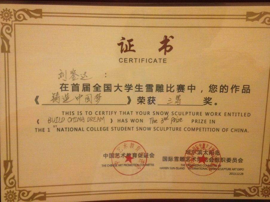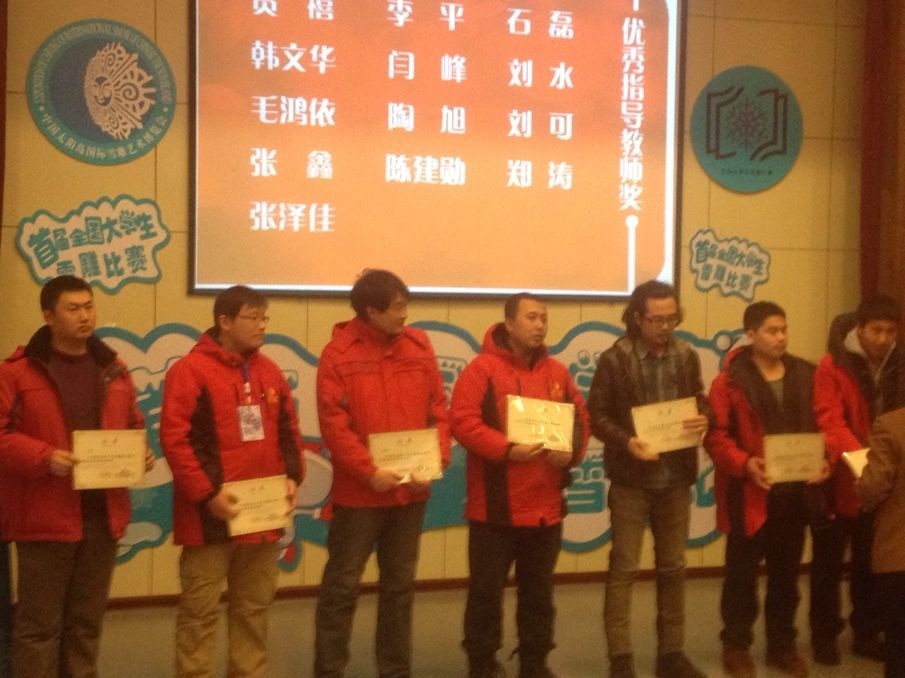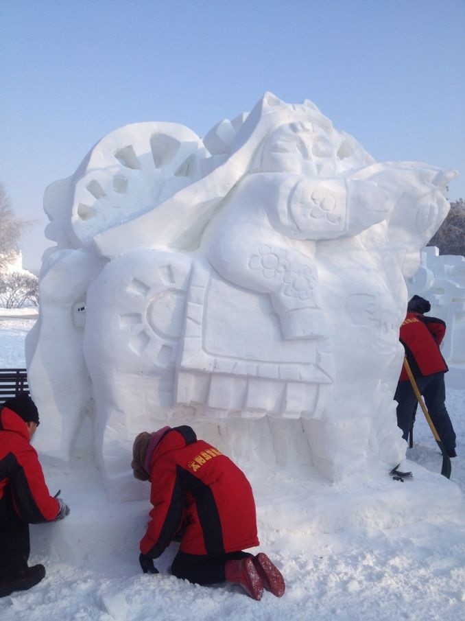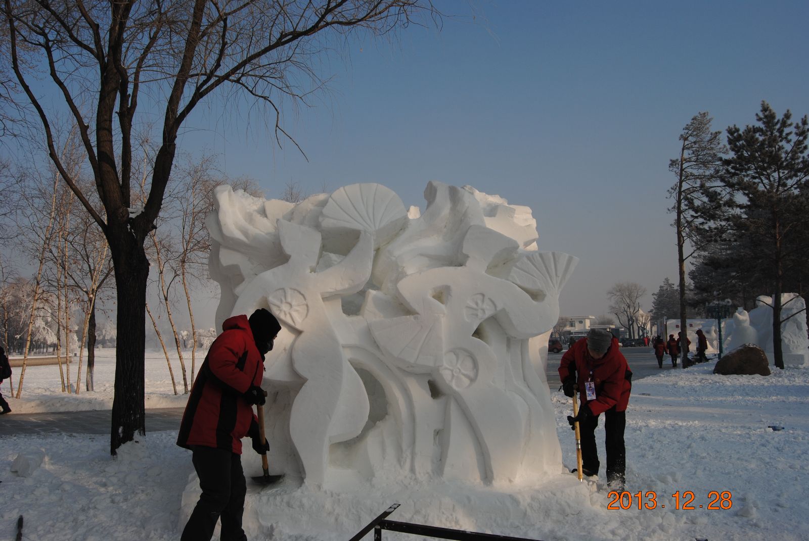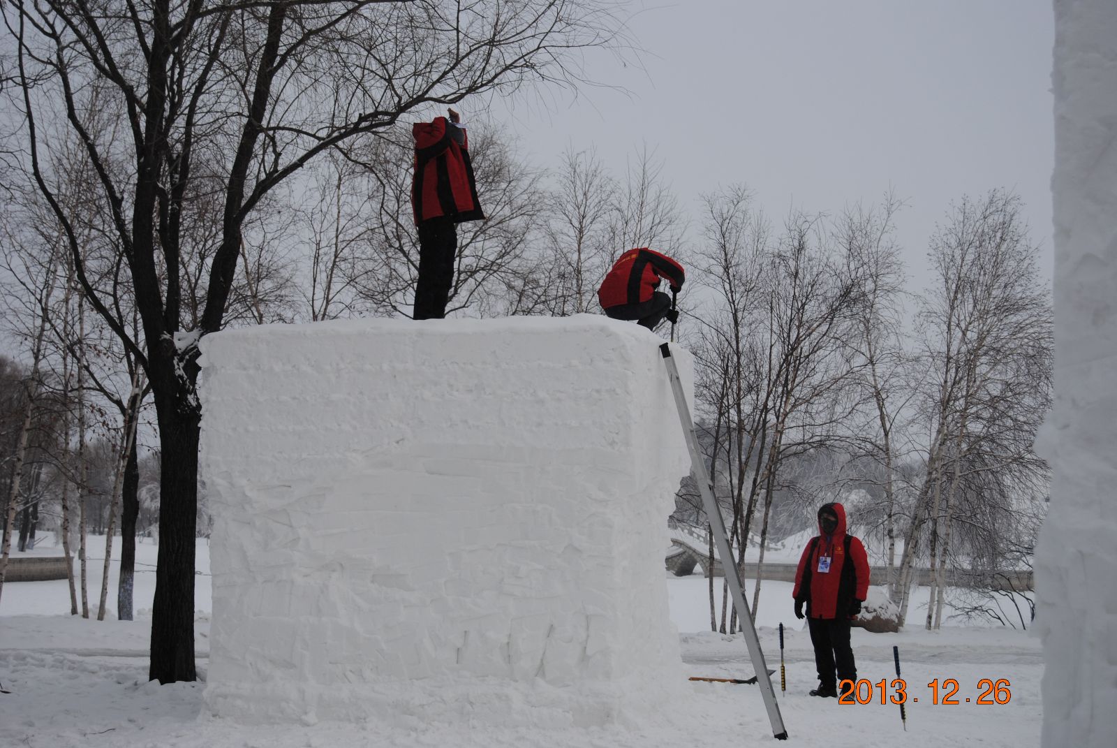据了解,本次赛事的参赛工作,得到了司徒安院长的高度重视,选拔指导教师和学生参加比赛,学院向教育部网站提交设计作品5件,2件作品顺利通过初选。由指导教师陶旭,2012级研究生关键,2012级本科生张诗莹、冯天南、闫天缘、姚建、刘健达、武文博组成的两支雪雕代表队,冒着零下30余度的严寒,经过4天的紧张创作,齐心协作、顽强拼搏,圆满完成了作品,展现了沈师大学子的艺术创造力和坚强的毅力。