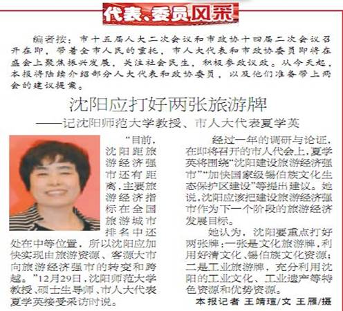 2013年12月31日,《沈阳日报》代表·委员风采栏目,刊登了记者王靖瑄于12月29日专题采访市人大代表、无党派人士、必赢官网旅游管理学院夏学英教授在即将召开的市十五届人大二次会议上提交的有关《沈阳应打好两张旅游牌,为建设沈阳旅游经济强市》建言献策的消息。