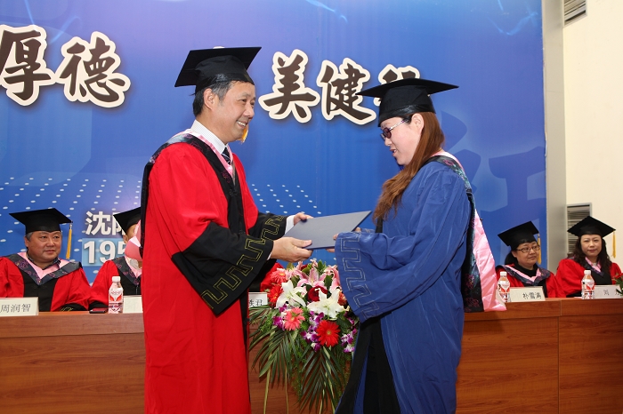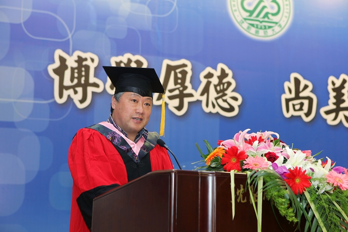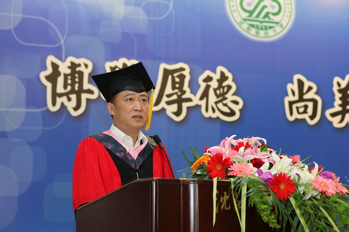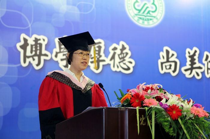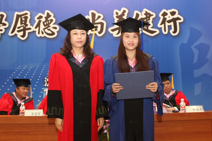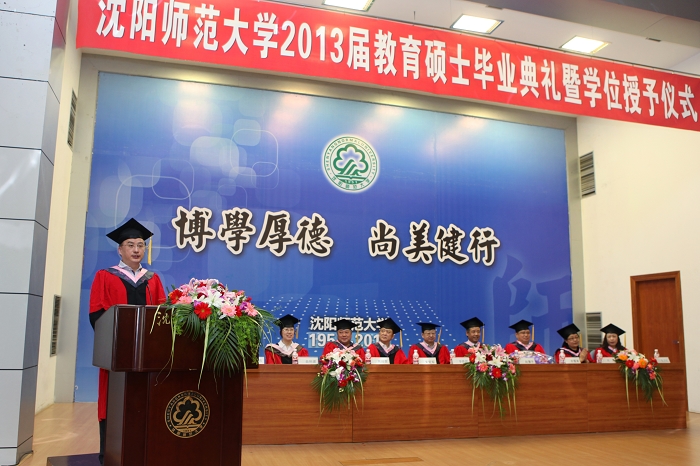 英语专业教学部曲艳娜教授随后代表教育硕士指导教师发言。她向获得教育硕士学位的同学表示诚挚的祝贺,并回顾了三年的学习过程,对同学们克服重重困难,冒着严寒和酷暑,牺牲了和家人团聚的时间,放弃了很多和孩子享受天伦之乐的的机会,来沈师大继续求学的精神表示由衷的敬意。随后她提出了三点希望与大家共勉:第一、继续保持“学以致恒”的治学态度。第二、继续提升自身素质,包括道德素质、文化素质、业务素质,做到知行统一,积善成德,以无愧于教师这个称号。第三、继续脚踏实地地对待工作,追求卓越。最后她希望同学们在离开沈师大之后能取得更丰硕的成果并能常回家看看。