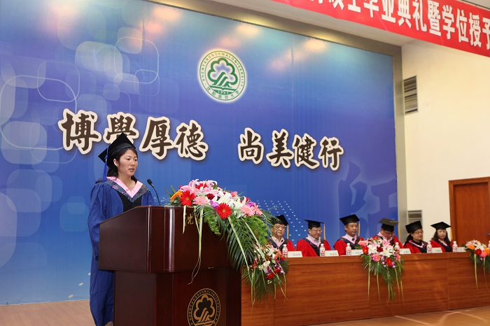 语文专业教学部2013届学科教学(语文)专业赵春玺同学代表毕业生发表了主题为“感恩、铭记、奋进”的发言。她首先向母校、学院老师、授课老师、论文指导教师和辅导员表示了敬意和谢意;对教育硕士研究生院所有老师的关心和支持表示感谢;同时对老师渊博的学识、深厚的教育理论基础、严谨的治学态度和辛勤的付出表达了由衷的敬佩;她表示今后将铭记老师们的睿智、博学和幽默。三年来深刻的受教历程,让同学们学会了如何调试好心态、调试好生活,以及调试成为更加合格的人民教师。最后她代表全体教育硕士表示将运用所学的理论知识与工作实践对接。在未来的职业生涯中,将把“厚德博学尊师乐教”的沈师教育硕士人精神融入到各自的教育工作中。用最优异的成绩回报恩师,回报母校,为师大的明天增光添彩!