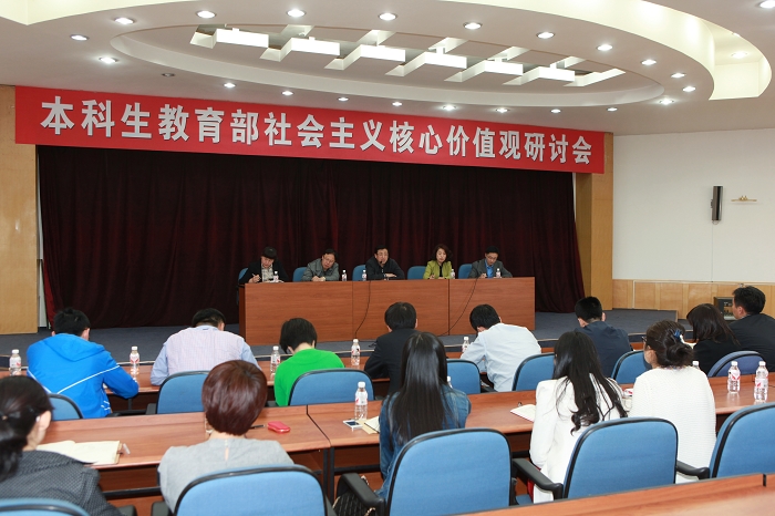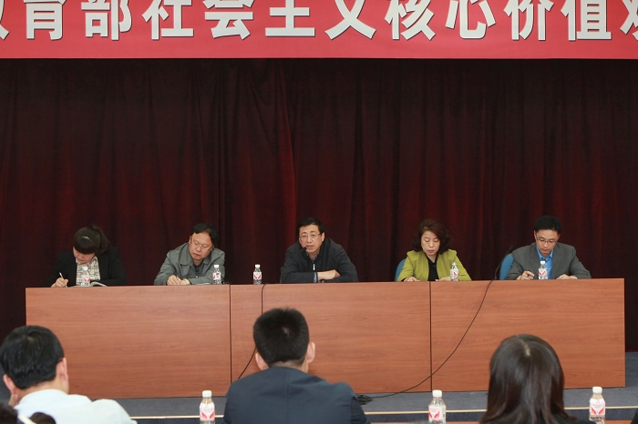校团委书记赵东方以“本科生教育部关于培育、践行社会主义核心价值观讨论交流”为题,从共青团工作角度,谈自己对培育践行社会主义核心价值观的体会和认识,借用儒家经典论著《论语·述而》中的名言“志于道,据于德,依于仁,游于艺”,阐述其中的青年成长成才之道。