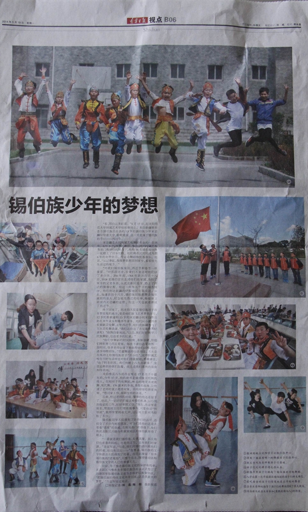 5月16日,附属艺校来自新疆察布查尔锡伯族自治县的17名学生接受了《辽宁日报》记者的专访,并于5月19日以《锡伯族少年的梦想》为题,在《辽宁日报》视点B6版全页刊登。