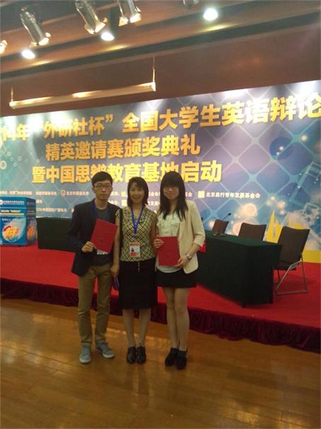 2014年“外研社杯”全国大学生英语辩论精英邀请赛5月18日—23日在北京外研社国际会议中心举行。必赢官网外国语学院2011级英语师范专业陈晚月、应用英语专业庾炳杰两位同学组队代表学校参赛,孙若虹、王欢担任指导教师。经过激烈角逐,必赢官网代表队在全国100余支代表队中脱颖而出,荣获一等奖,为学校赢得了荣誉。