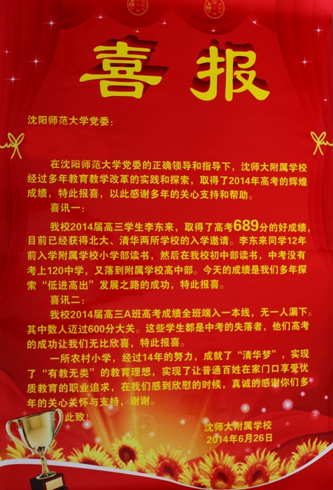 李东来同学只是师大附属学校2014年高考毕业生中取得优异成绩的代表之一。据悉,师大附属学校高三A班今年的高考成绩也创造了自附中建立以来的奇迹。全班同学全部通过一本录取控制线,无一人落伍。其中,有数名毕业生的成绩迈入了600分大关。