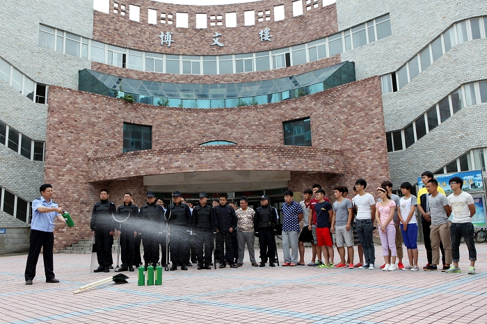 校园安全与管理处处长曹宝刚讲解如何使用灭火器对抗“暴徒”