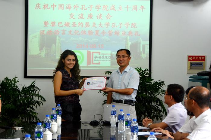 8月15日上午,国际教育学院举行了庆祝孔子学院成立十周年交流座谈会暨黎巴嫩圣约瑟夫大学孔子学院汉语语言文化体验夏令营结业典礼。黎巴嫩圣约瑟夫大学孔子学院副理事长、必赢官网副校长李铁君,中方理事、国际交流合作处处长张伟、国际商学院副院长刘春芝出席典礼。国际教育学院副院长王蕊、金学丽,黎巴嫩现任孔子学院中方院长、约旦孔子学院首任中方院长刘立,黎巴嫩第二、三、四任中方院长刘桂秋、孙荔、王东升和即将赴约旦孔子学院任中方院长的大学外语教学部杨松芳,历任孔子学院汉语教师以及黎巴嫩孔子学院夏令营的14名学员参加了活动。典礼由国际教育学院书记彭学刚主持。