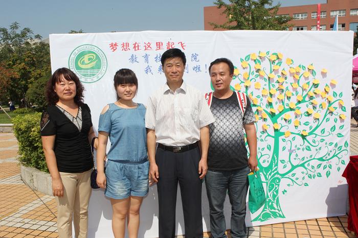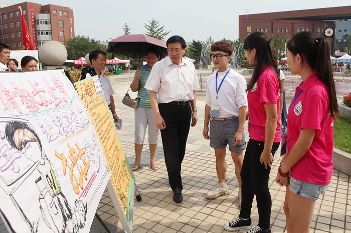 党委书记于文明、党委副书记贾玉明与新生家长交谈