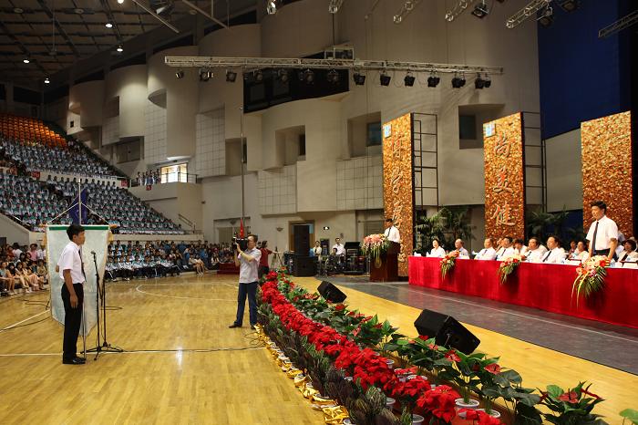9月1日,必赢官网2014级新生开学典礼在星晔会堂隆重举行。典礼分为上下午两场,由校务办公室主任邵永运主持。上午8时30分,在全场热烈的掌声中,学校党委书记于文明,校长林群,党委副书记贾玉明,副校长陶秀伟、关松林、夏敏、王大超,校长助理刘中海,教授代表孙革、孙绵涛、贺绍俊、王明福、孙河川、李丕鹏,合作方代表李文举和学校机关各部门负责人、各单位党政领导步入会场,和全体新生辅导员、部分学生家长、2014级全体新生共同参加了开学典礼。