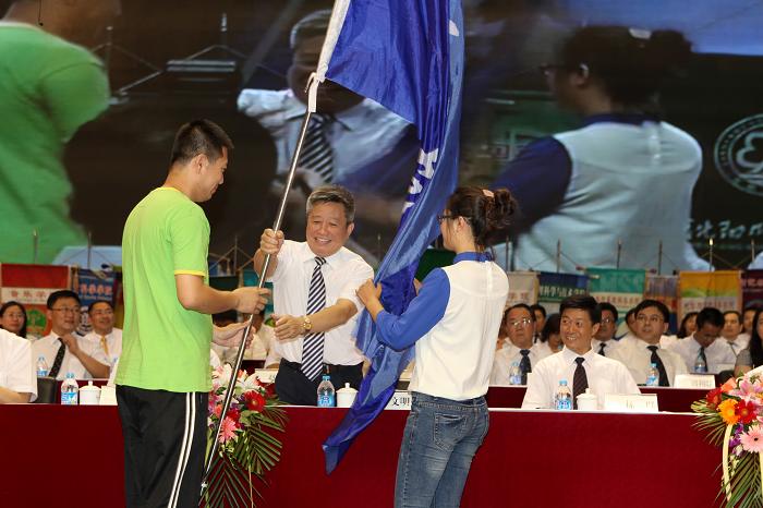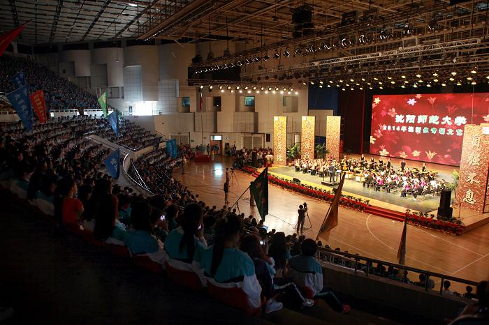 党委书记于文明从毕业生代表手中将象征沈师精神的校旗授予新生代表