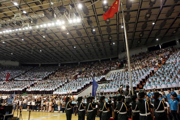 伴随着慷慨激昂的乐曲,2014级新生报到仪式开始。各学院新生代表高举院旗向所在学院的院长报到。体育科学学院张晟嘉同学代表6914名新生向校长报到。至此,来自全国26个省市的5694名本科生、1005名研究生和来自34个国家的215名留学生正式报到。他们的到来,为师大注入了新鲜的血液,给学校发展增添了无限的活力。