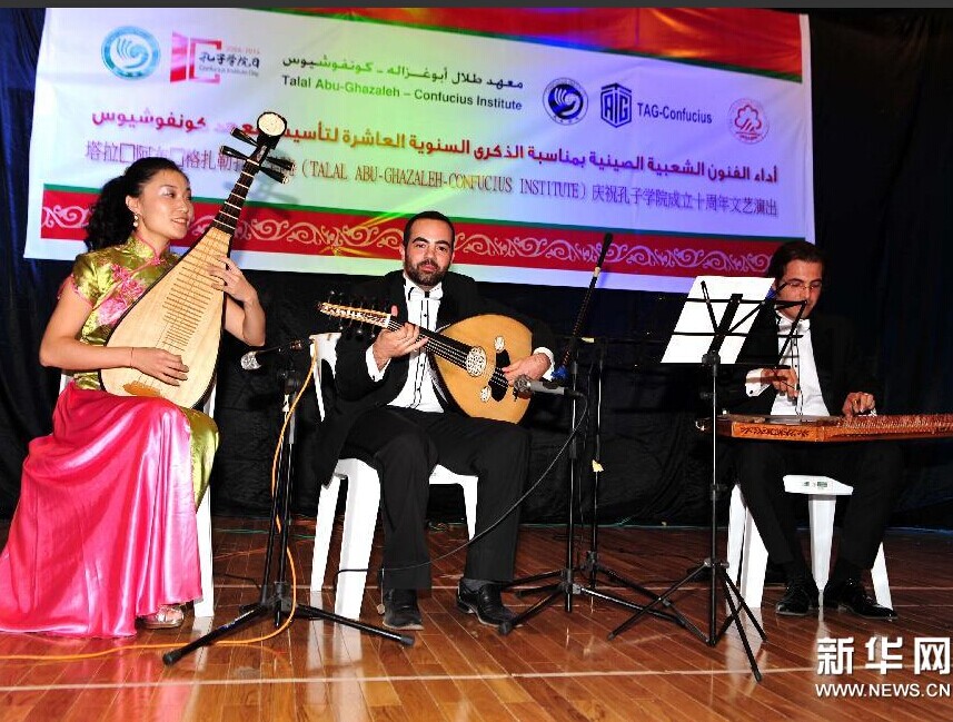在约旦首都安曼,中国和约旦演员同台演出乐器合奏。
