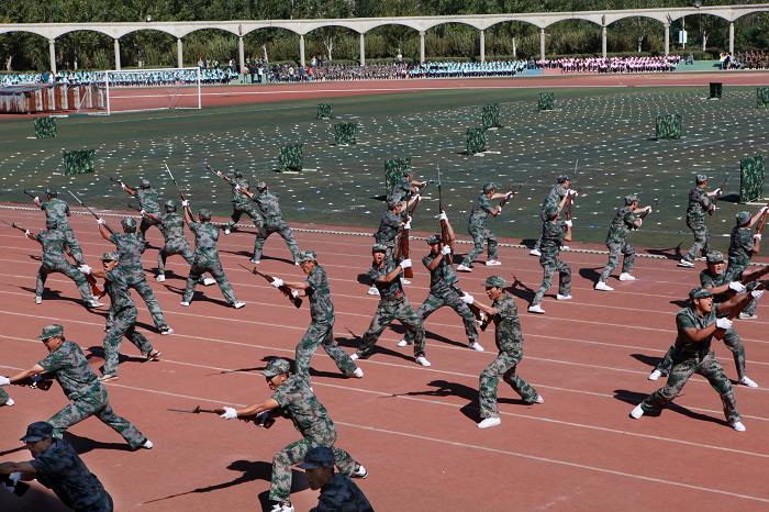 在队列歌曲表演中,各个队列学院歌声嘹亮,动作整齐。特别值得一提的是软件学院的队列刺刀表演,他们激情满怀,每一次有力、整齐划一的动作都体现了男儿豪情壮志的本色。