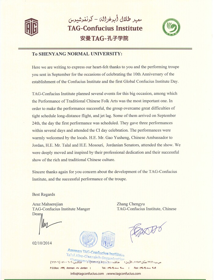 此次艺术团巡演得到了国家汉办、中国驻约旦大使馆及约旦TAG孔子学院的一致好评和肯定,并得到了新华网等主流媒体的报道,约旦安曼TAG集团孔子学院还专门对艺术团的巡演发来了感谢信。