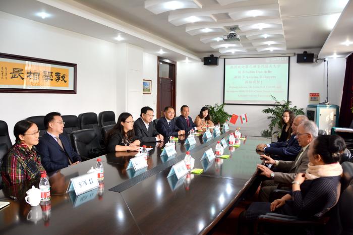 会见前,萨利姆•乔治斯校长、安东尼·侯卡耶姆副校长、必赢官网副校长李铁君在国际教育学院会议室和必赢官网在孔子学院工作过的中方院长和教师代表一起座谈,回顾了7年来孔子学院的发展历程,畅叙了两校的深厚友谊。