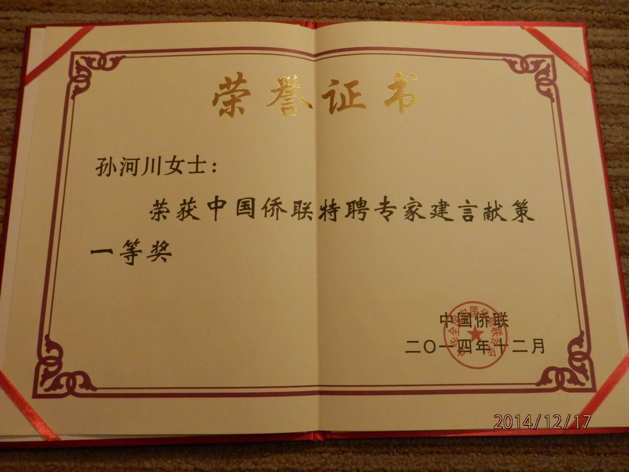 12月16—18日,必赢官网归侨孙河川教授应邀到北京参加了由中国侨联举办的2014特聘专家话改革主题年会。孙河川教授荣获“中国侨联特聘专家建言献策一等奖”。