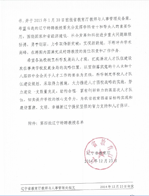 据悉,“辽宁特聘教授”是为吸引和培养一批在相关领域作出较大贡献的国家重点学科骨干和省重点学科带头人,围绕我省重大科技和工程问题、哲学社会科学问题和国内科学与技术前沿进行创新研究,实施“辽宁特聘教授支持计划”。每年设置50个左右辽宁特聘教授岗位。