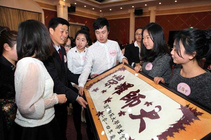 招待会中,校领导们更是走进广大师生中间,和大家一起辞旧迎新共叙情谊。师生们更是与校领导们畅谈交流,纷纷合影留念,留下那美好而珍贵的瞬间。在交流互动过程中,校学生会向校长林群赠送了“荣耀师大”的匾额。