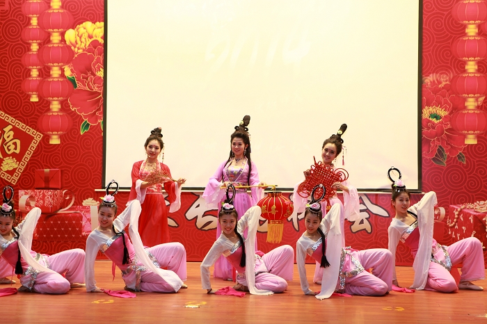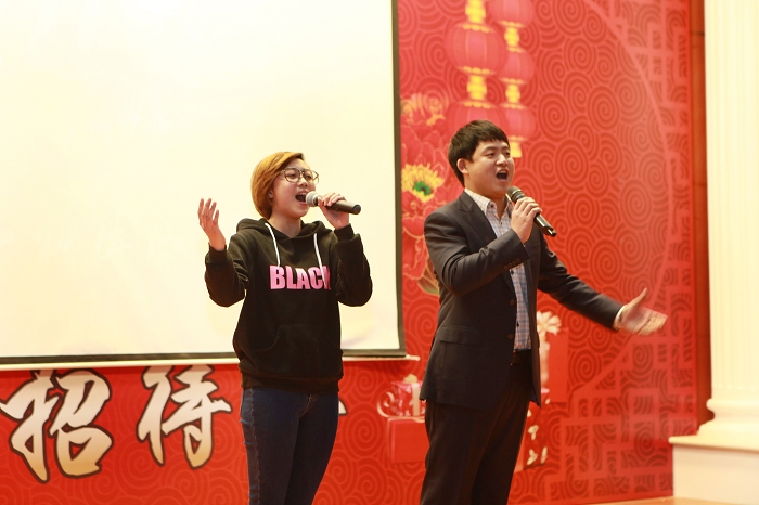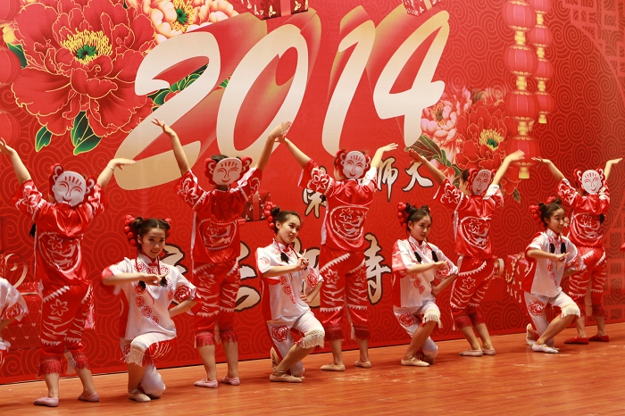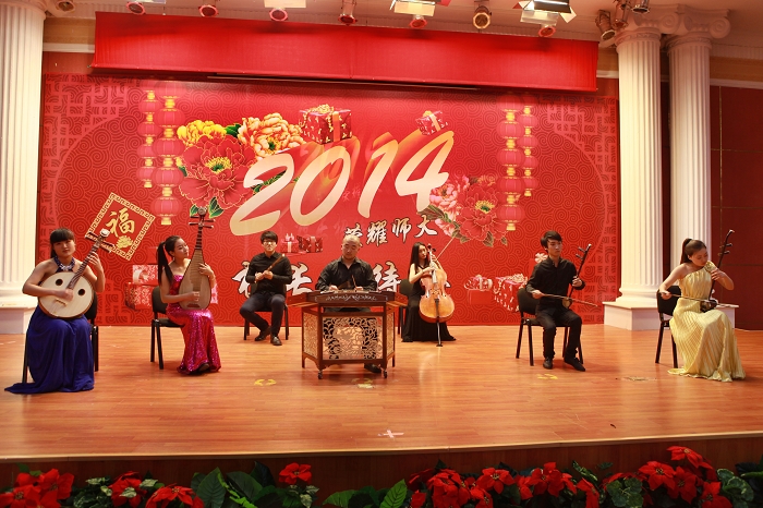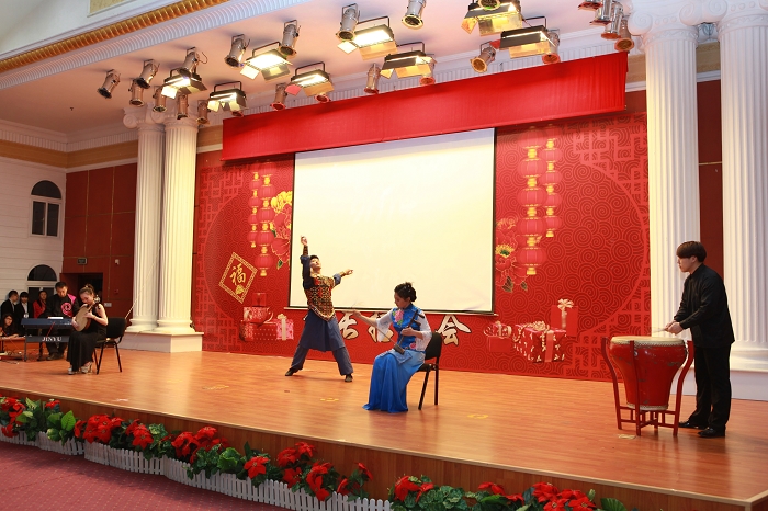期间,师生表演了精彩的文艺节目,为招待会增添了喜庆气氛。蔡鸿鹏老师与师大新声音冠军张静怡为大家献上歌曲《地球是个美丽的圆》,欢快的歌声传递出了对新一年的美好祝愿与期望;艺术与戏曲相结合的京剧器乐演奏舞蹈《夜深沉》大气豪迈,展现了师生精彩的演奏技艺;梅兰芳艺术研究所肖迪演唱了今年登上国家大剧院的京剧艺术瑰宝《嫦娥奔月》中一百年前唯一保留下来的“南梆子”唱段,精彩的演绎诠释了国粹京剧“以形传神,形神兼备”的艺术境界;舞蹈表演《剪纸姑娘》展现了“一剪之趣夺神功,美在民间永不朽”的奇妙韵味;现代京剧《红色娘子军》、民乐演奏更增添了浓厚的文化气息。现场气氛热烈,时时充满着欢声笑语。