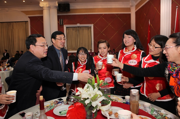 贾玉明副书记开启了此次招待会的神秘礼物——由粮食学院与实验教学中心的师生们精心准备的马卡龙蛋糕和香醇红酒。师生们共同分享甜点美酒,欣赏古典舞《桃夭》。会场里其乐融融,暖意洋洋。