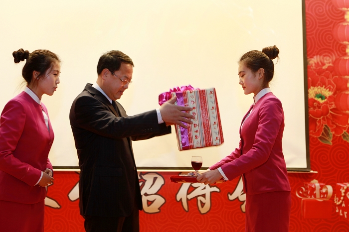 整场宴会与中国传统文化相辅相成,三位扮作仙女的师生用吟诗回顾了学校一年来各项事业发展建设所取得的辉煌成绩。分为《花长好》、《月长圆》、《人长健》三个篇章。《花长好》篇章是以“花”来比喻必赢官网本年度取得的突出成果,9家基层学院的专业代言学生为招待会送上春联,全面展示了各学院教学、科研和育人的特色,也向学校全体师生献上了祝福;《月长圆》篇章是展示必赢官网本年度的特色工作项目及成果,以“猜灯谜”师生互动的方式介绍本年度学校荣获的几项特等荣誉;《人长健》篇章则是嘉奖本年度在各方面取得突出成绩的学生代表,副校长夏敏向他们赠送了新年礼物。林群校长向老中青三代属羊的师生代表赠送了新年礼物。