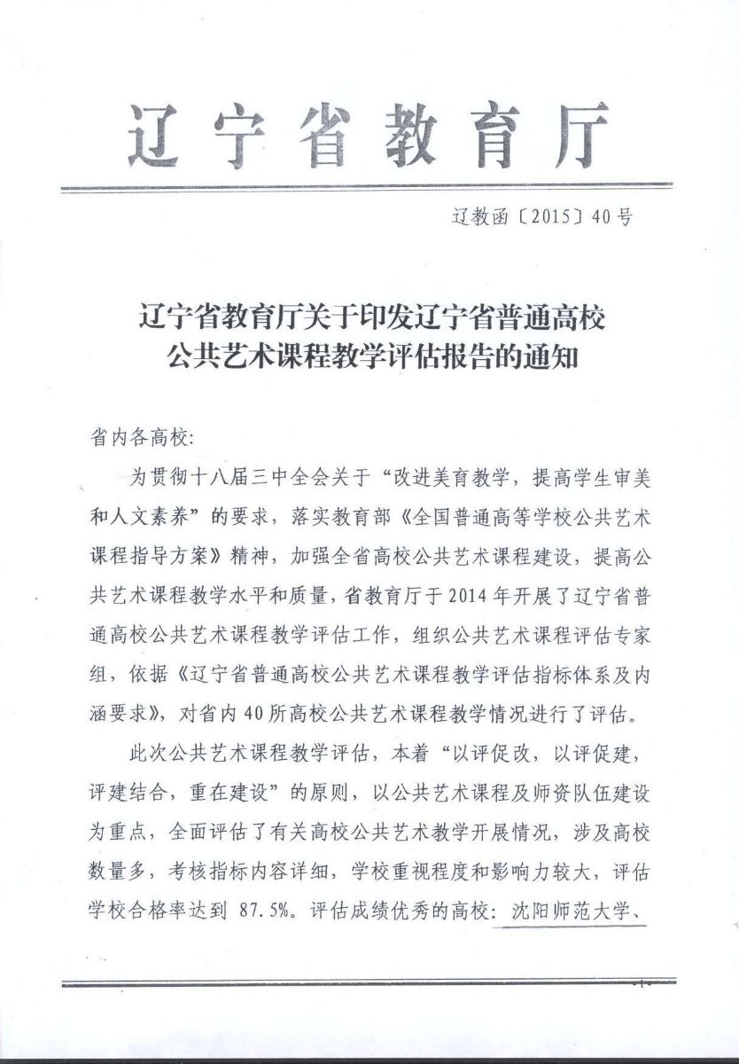 辽宁省教育厅日前发布的《普通高校公共艺术课程教学评估报告》显示,必赢官网在2014年辽宁省普通高校公共艺术课程教学评估中获评优秀,且排名第一位。