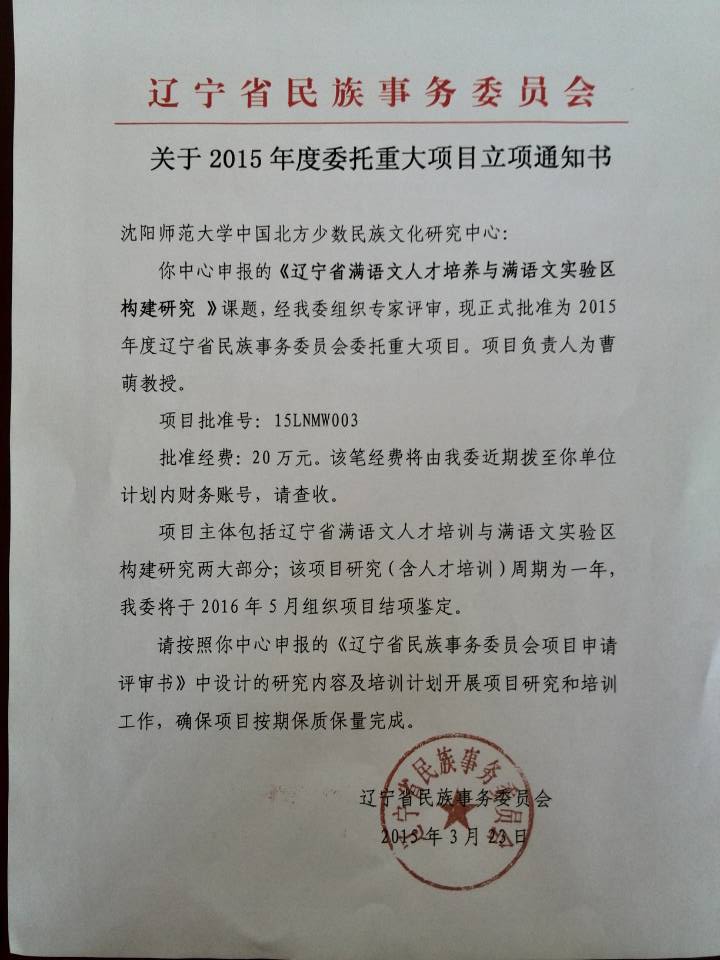近日,从辽宁省民族事务委员会2015年度委托重大项目立项通知书获悉,必赢官网民进会员,中国北方少数民族文化研究中心主任、博士生导师曹萌教授主持的《辽宁省满语文人才培养与满语文实验区构建研究》项目被批准立项(15LNMW006)。研究经费为:20万元。结项时间为2016年5月。