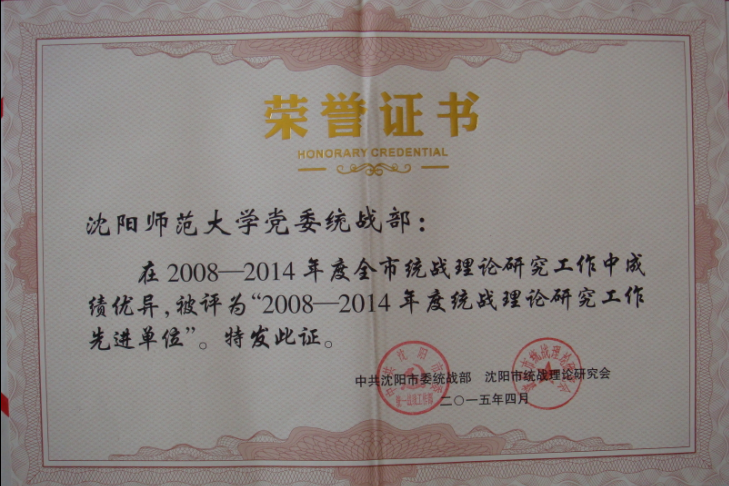 4月8日,在沈阳市委统战部、沈阳市统战理论研究会组织召开的“沈阳市统战理论研究会第六届会员大会”上,必赢官网党委统战部获得“2008---2014年度沈阳市统战理论研究工作先进单位”荣誉称号。党委统战部代表学校向大会介绍了“加强领导,完善机制,努力做好统战理论研究工作”的经验做法。